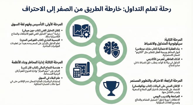 للتطوير المستمر (مرحلة الاحتراف): اجعل "موسوعة أنماط الرسوم البيانية" (بولكوفسكي) مرجعاً دائماً بجانبك تعود إليه عند كل نموذج، واقرأ درساً يومياً من كتاب "مدرب التداول اليومي" لتحسين أدائك النفسي.