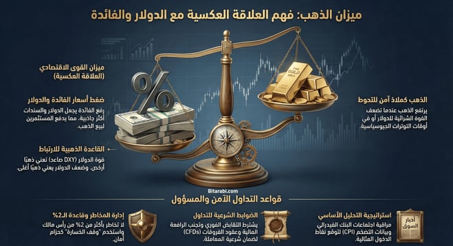 الذهب مُسعّر عالمياً بالدولار الأمريكي (XAU/USD). هذه العلاقة الحسابية تخلق ميزان كفة: