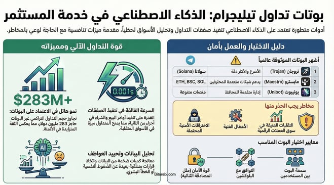 بوتات التداول عبارة عن أدوات ذكية في موقع تيليجرام Telegram تعتمد على الذكاء الاصطناعي والبرمجة، يمكن الاستفادة منها من قبل المستثمرين في مجالات التداول في 2026، ومتابعة الأخبار المالية والأسعار في السوق المالي وتحويل الخدمات وتوفير تحليلات ورسوم بيانية للعملات الرقمية والأسهم. وتوفر بعض هذه البوتات توصيات تداول أو إشارات بيع وشراء في العملات الرقمية، وهو ما جعلها تكتسب شعبية كبيرة بين المتداولين المبتدئين والمحترفين.