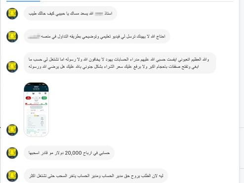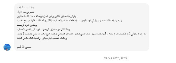سيناريو كلاسيكي آخر لعميل مختلف: تم إيهامه بالربح في البداية، ثم مطالبته بـ "تعزيز الرصيد" (إيداع المزيد) لإنقاذ الحساب من صفقات خاسرة، مما أدى لاستنزافه مادياً حتى اضطر للاقتراض وبيع ممتلكاته